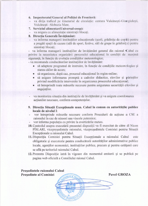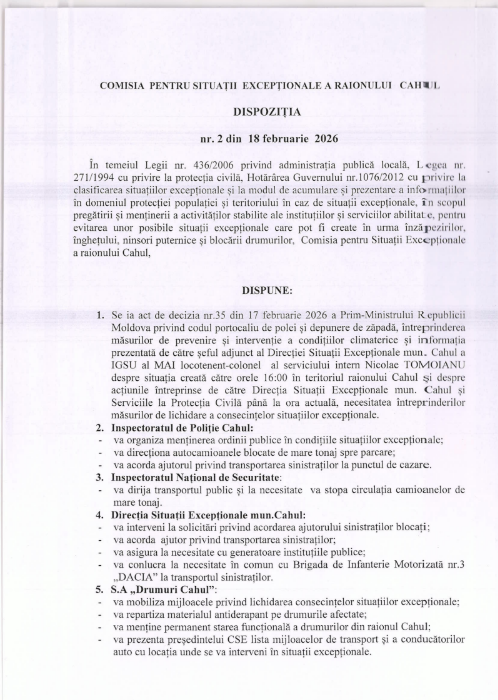 Ca urmare a celor discutate, a fost emisă Dispoziția nr. 2 din 18 februarie 2026 a Comisiei pentru Situații Excepționale a raionului Cahul (anexată mai jos).