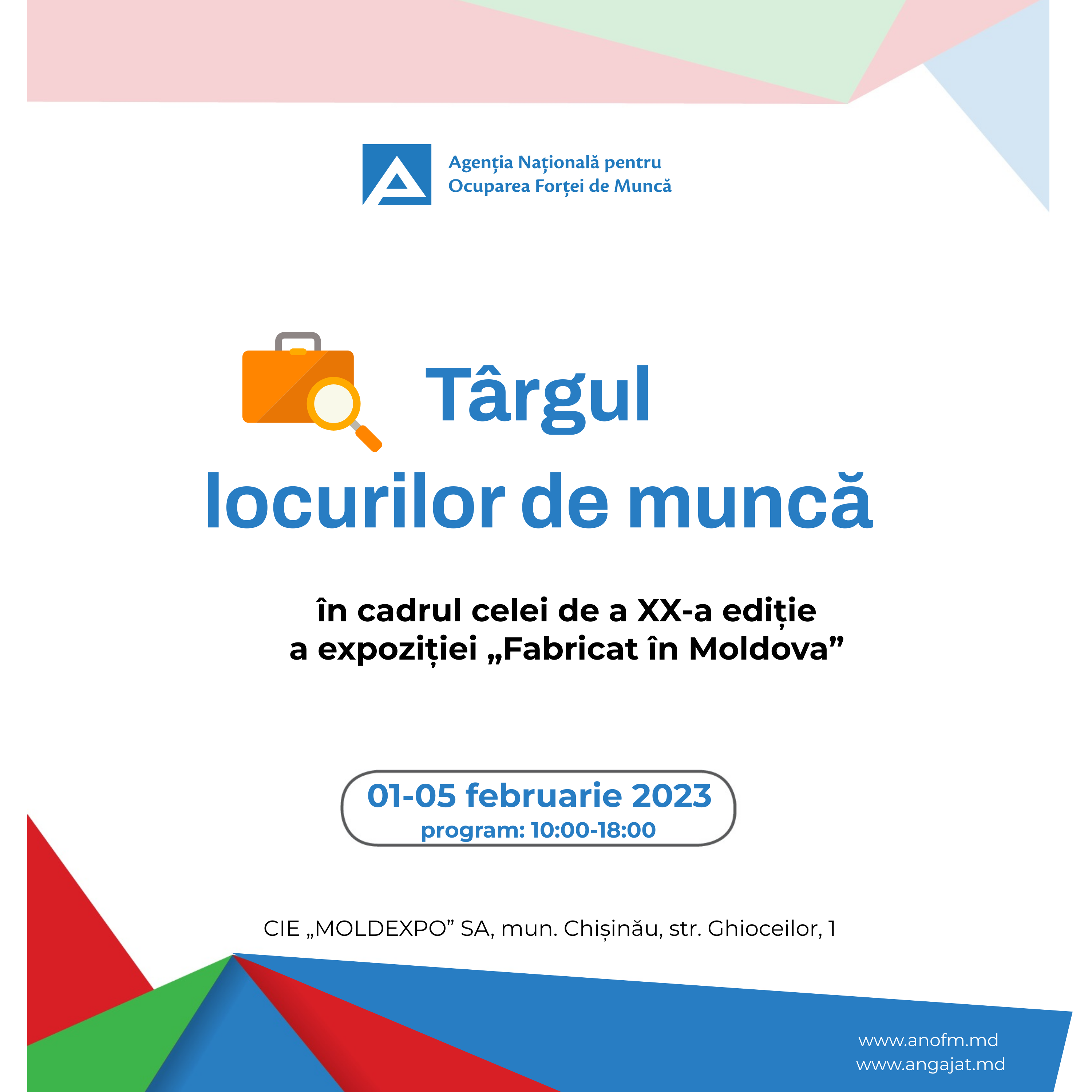 Târgul locurilor de muncă, care se va desfășura în perioada 01-05 februarie 2023, între orele 10:00-18:00, în incinta CIE „Moldexpo” SA, mun. Chișinău, str. Ghioceilor, nr. 1.